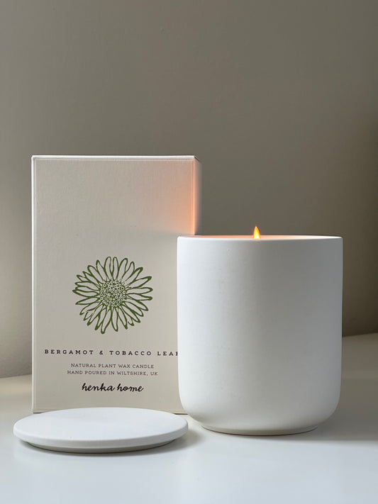 CERAMIC CANDLE ~ BERGAMOT & TOBACCO LEAF