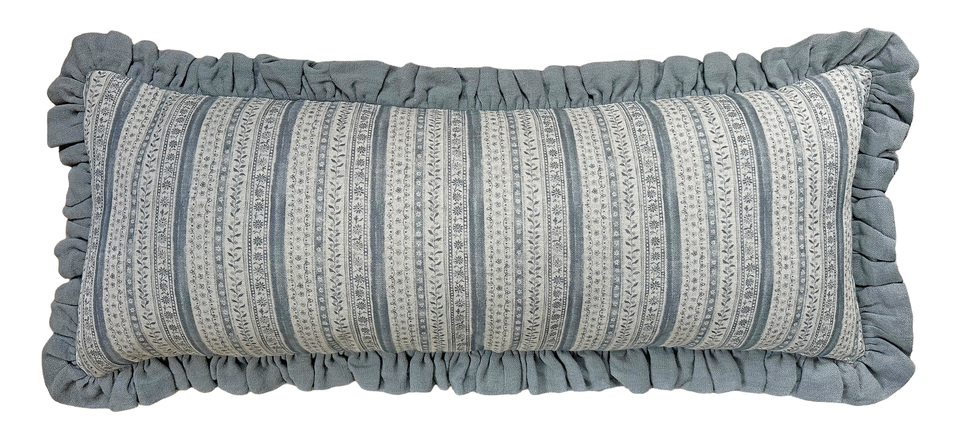 Lumbar cushion made from our Daisy Chain fabric in Flax Flower, with coordinating blue linen ruffle trim. Filled with a feather inner for a luxuriously plump look and feel.