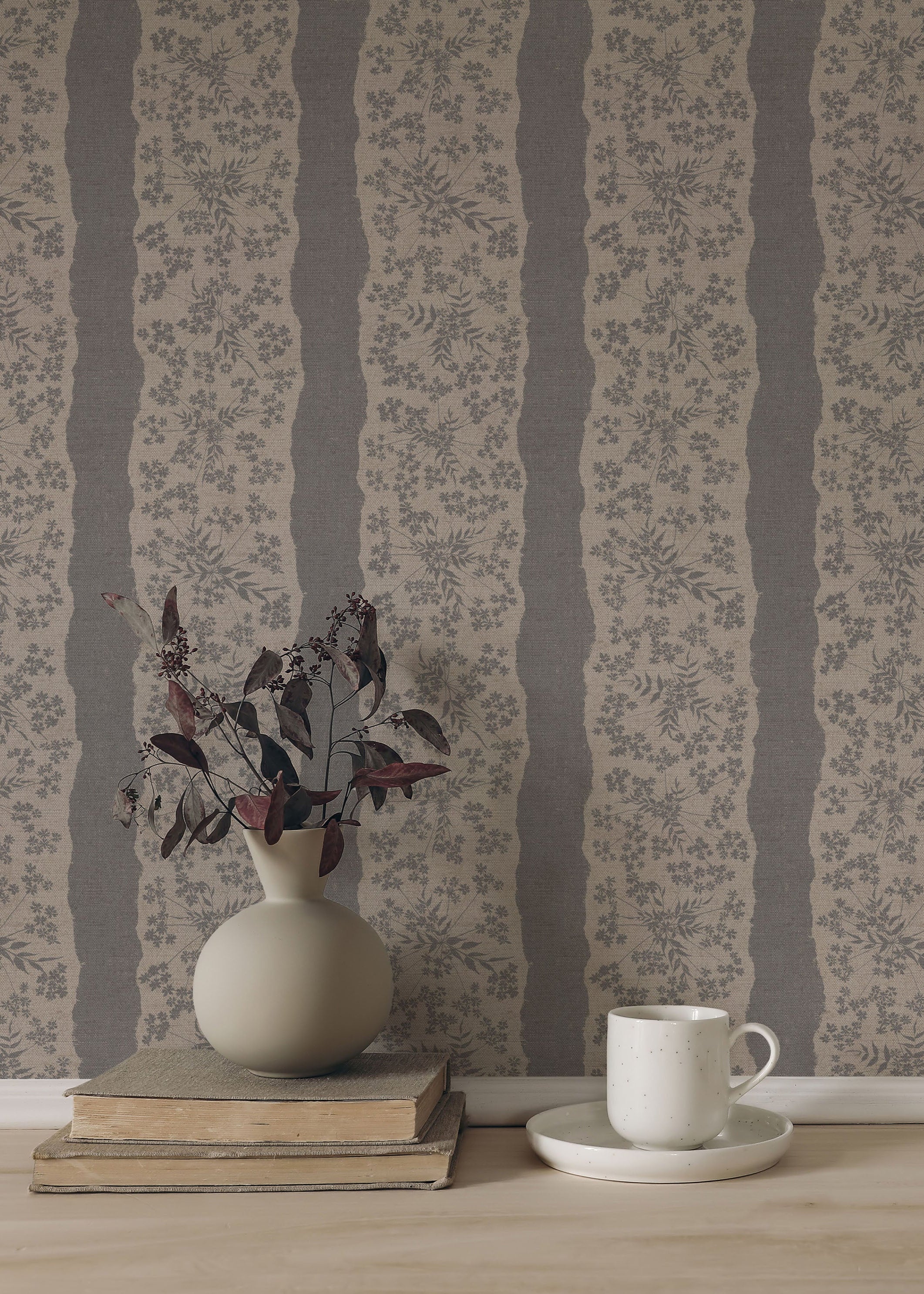 Hand drawn design, with a textured linen look background to match our fabric. Digitally printed onto a tactile, fibrous non-woven paper with a flat, matt printed finish. Available in a matching fabric.