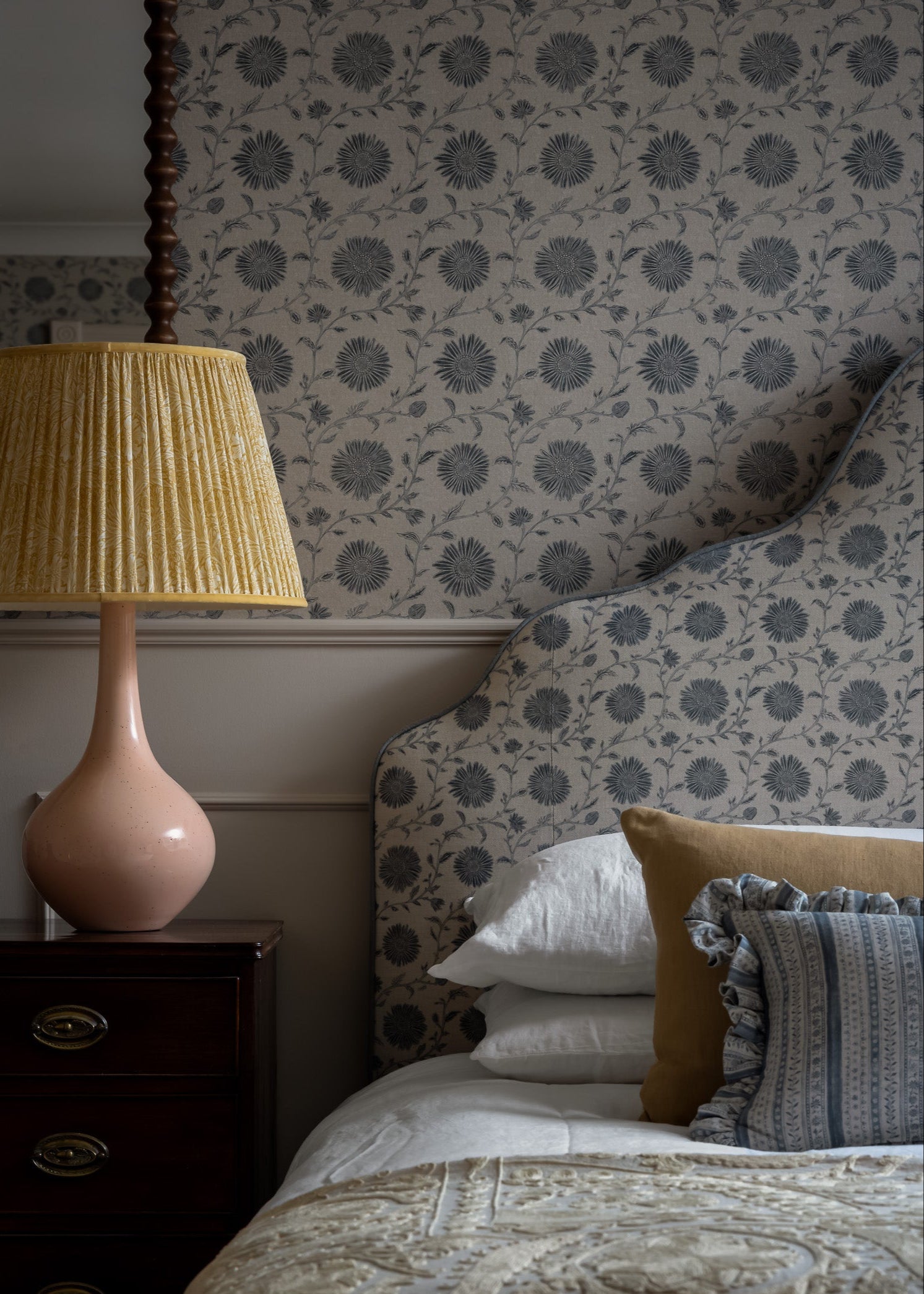 An elegant and sophisticated bedroom suite, featuring our Moonpenny wallpaper in Flax Flower with matching fabric headboard. The soft plaster pink panelling compliments the muted blue tones, with the mustard yellow accents providing bursts of warmth and colour this otherwise calm palette.