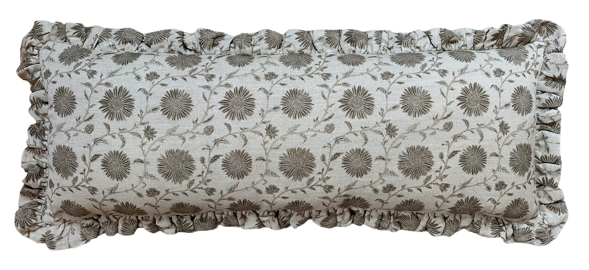 Lumbar cushion made with our Moonpenny fabric in Clay, with matching ruffle trim. Filled with a feather inner for a luxuriously plump look and feel.